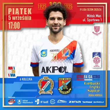 W piątek 5 września na stadionie MOSiR przy ul. Sportowej 1 odbędzie się spotkanie 6. kolejki IV Ligi Mazowieckiej między miejscową Mazovią a GKS Wilga Garwolin. Mecz rozgrywany jest w jubileuszowym sezonie 100-lecia klubu Mazovia Mińsk Mazowiecki.